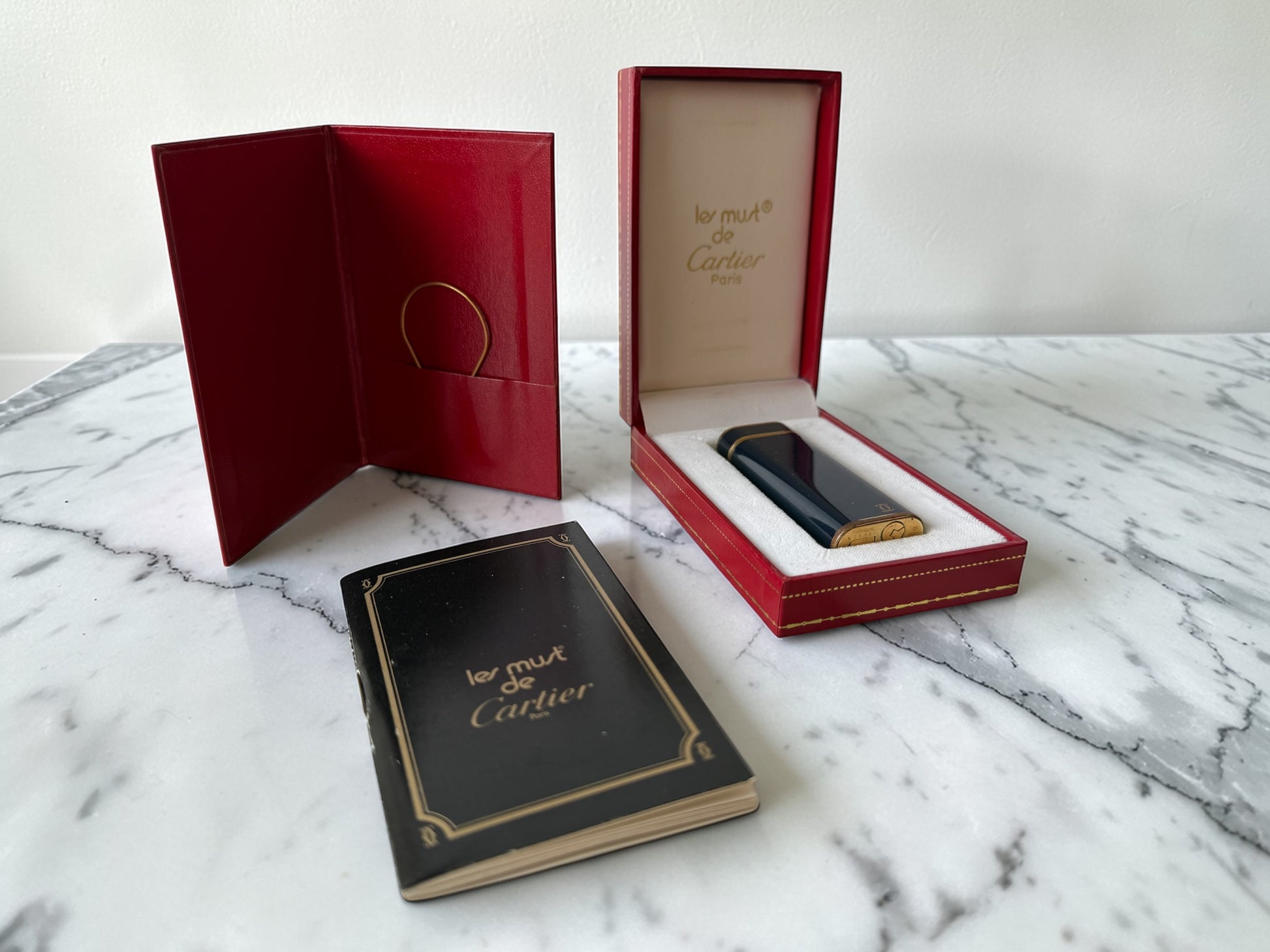 A "Les Must de Cartier" in deep navy lacquer with gold-plated trim, sourced from a New York estate sale with the original red Cartier box and papers intact. The double-C logo catches the light at every angle, and the roller mechanism still sparks with the kind of satisfying weight that only comes from something built to be kept, not replaced.